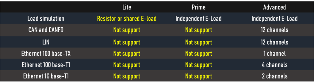 Default load is 250ohm resistor, can can switch to shared e-load 0~5A. All support fault injection test.
